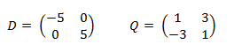 en el ejemplo 1 de la pestaña definiciones se calcularon los autovalores y autovectores de A. Los autovalores son λ1 = -5 y λ2 = 5, y los autovectores asociados son v1 = (1, -3)t y v2 = (3, 1)t. Por lo tanto, A es semejante a la matriz D con matriz de paso Q, siendo: