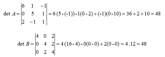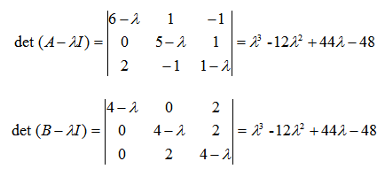 Sus determinantes coinciden. Dado que los determinantes de A y B son distintos a cero, podemos decir que ambas matrices tienen rango 3, por lo tanto, coinciden sus rangos. Calculamos las trazas: tr(A) = 6 + 5 + 1 = 12 tr(B) = 4 + 4 + 4 = 12 Sus trazas coinciden. Calculamos el polinomio característico